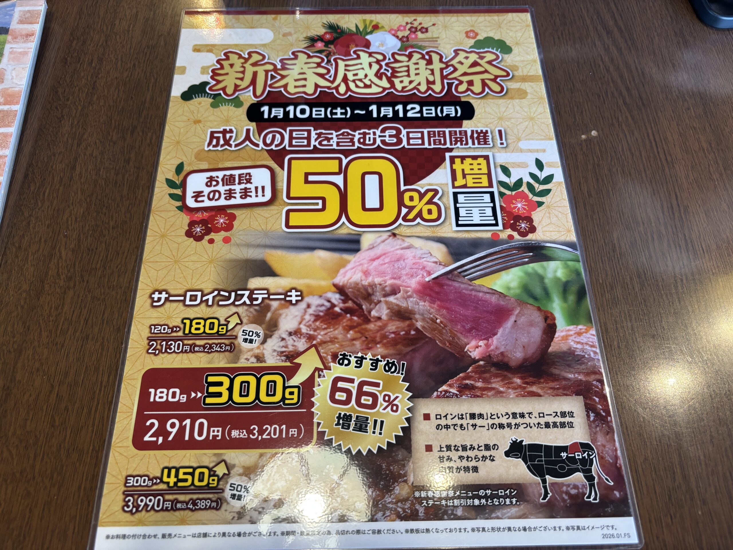 サーロインステーキが、お値段そのままで50%増量!これはお得ですね!