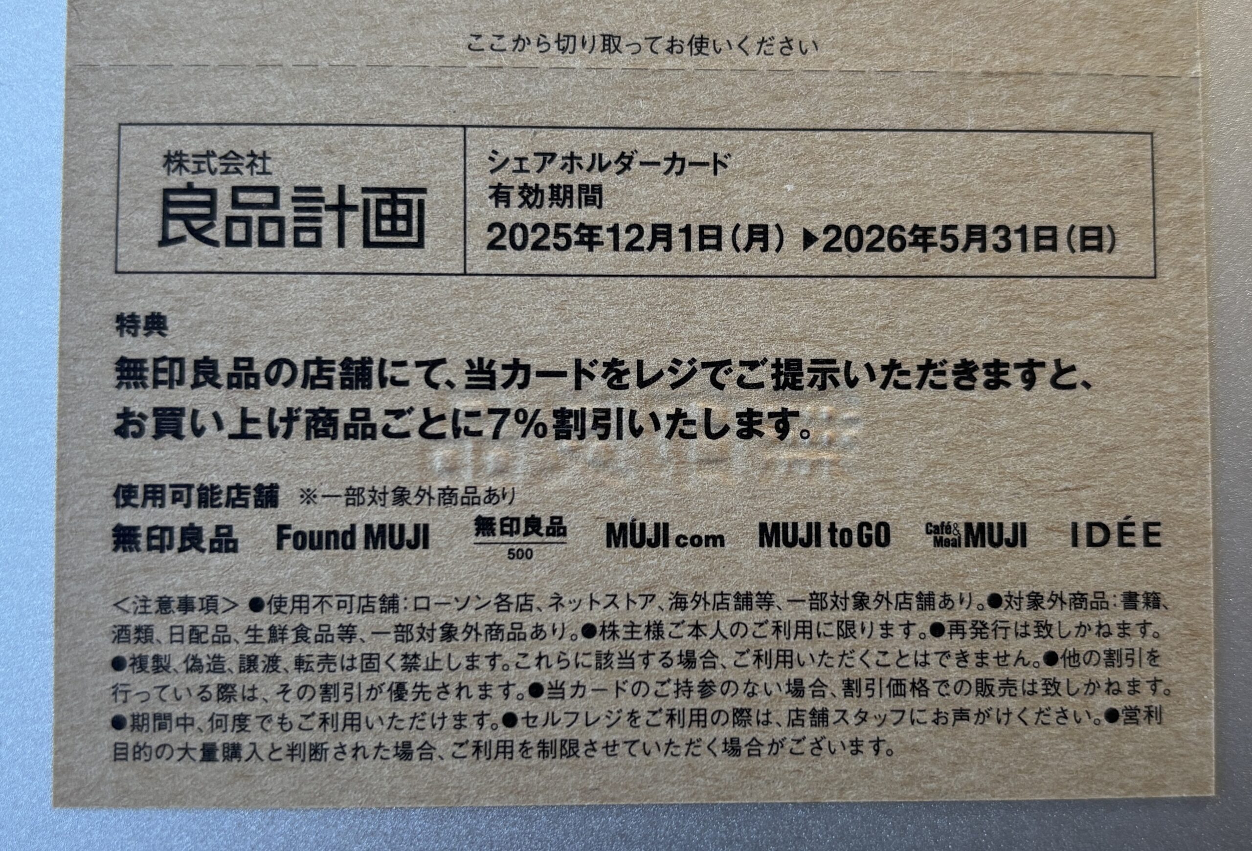 8月権利の 良品計画 の株主優待券(シェアホルダーカード)が届いています(2025年11月29日到着)