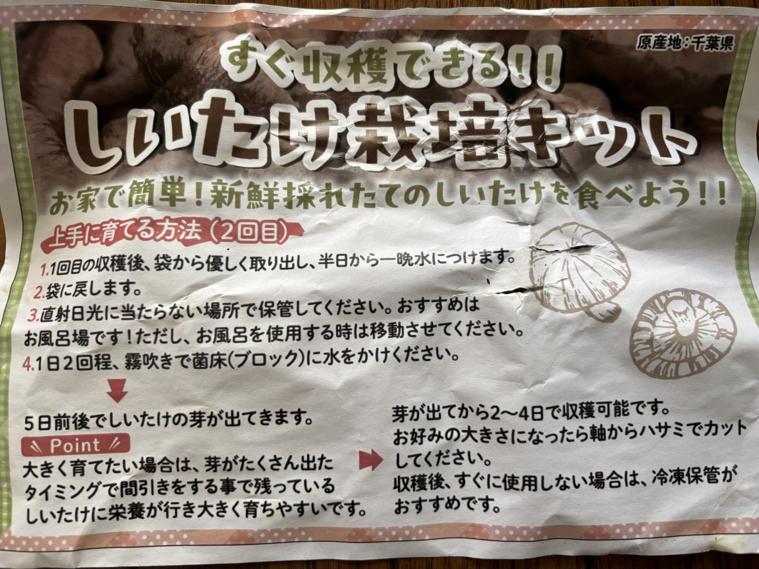 ▼説明書です。今生えているしいたけを収穫した後、休ませて「もう1回」収穫できるみたいです。