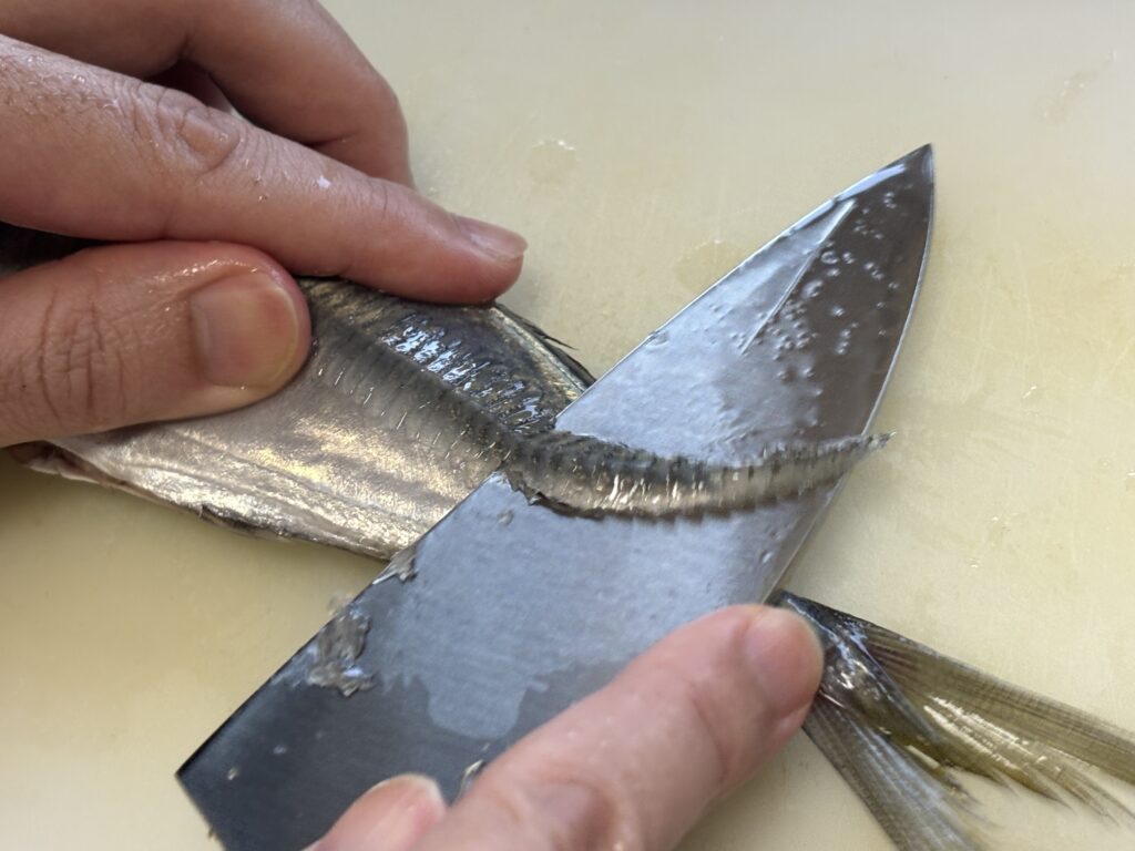 なんと、アジの南蛮漬けを作ってくれるそうです!早速さばき始めています……。がんばれ~ヾ(≧▽≦)ノ