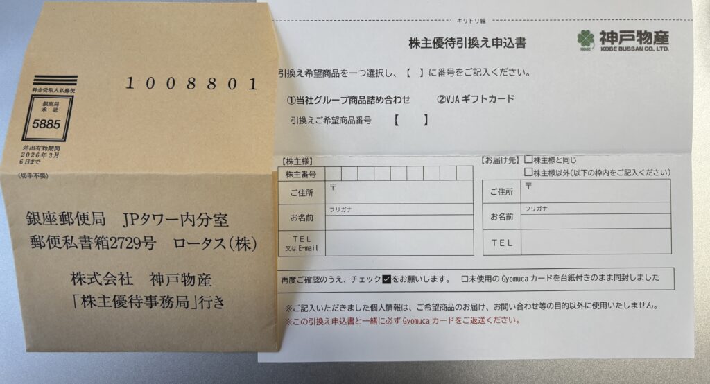 10月権利の 神戸物産の株主優待カードが届きました (2026年1月13日到着)