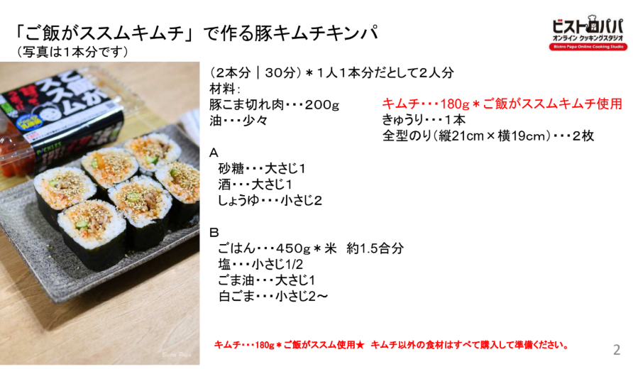 オンラインの料理教室には初めて参加しましたが、気軽で良かったです。当日参加できなくても、youtubeで繰り返し見られるのもいいですね。節分にはキンパを作ってみようかなと思います♪
