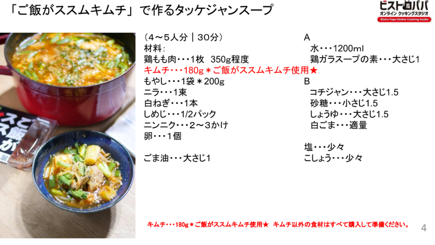 ①「ご飯がススムキムチ」で作るタッケジャンスープ