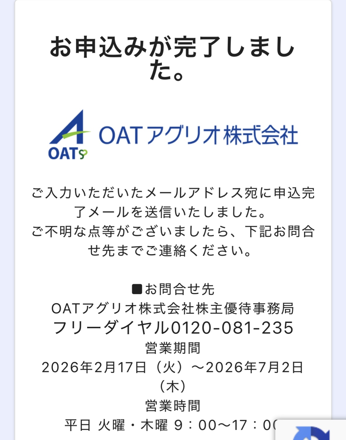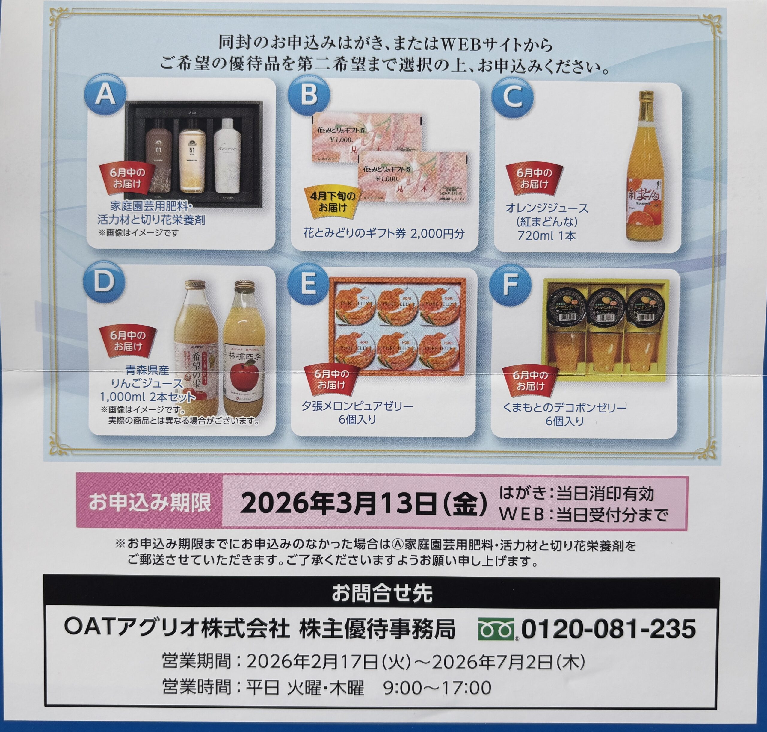 12月権利の OATアグリオ (4979)の株主優待案内が届きました (2/16到着)