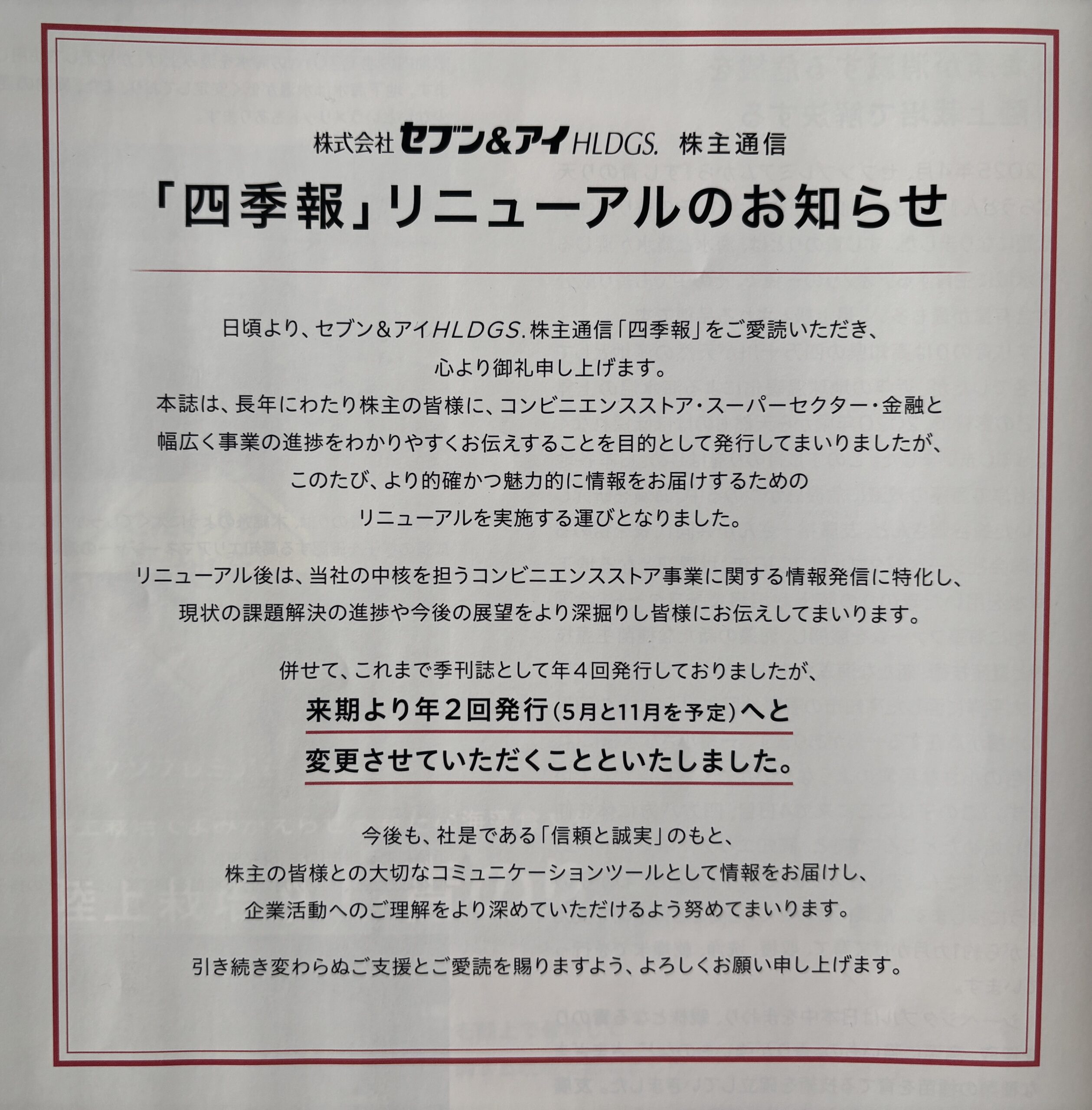 来期からは5月11月の年2回発行に変更されるそうです。