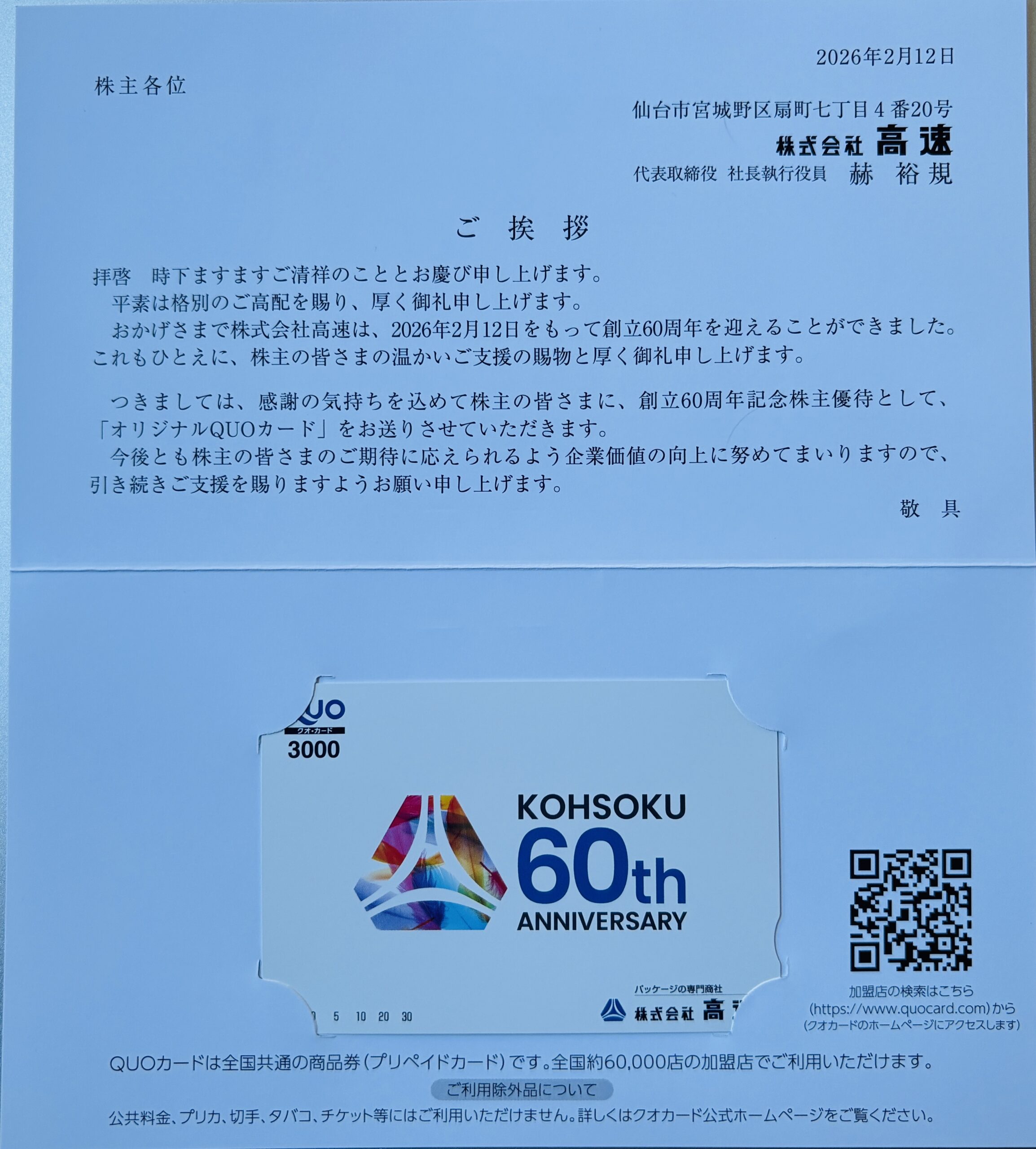 12月権利 創立60周年記念の記念優待の「オリジナルQUOカード 3000円相当」が届きました。