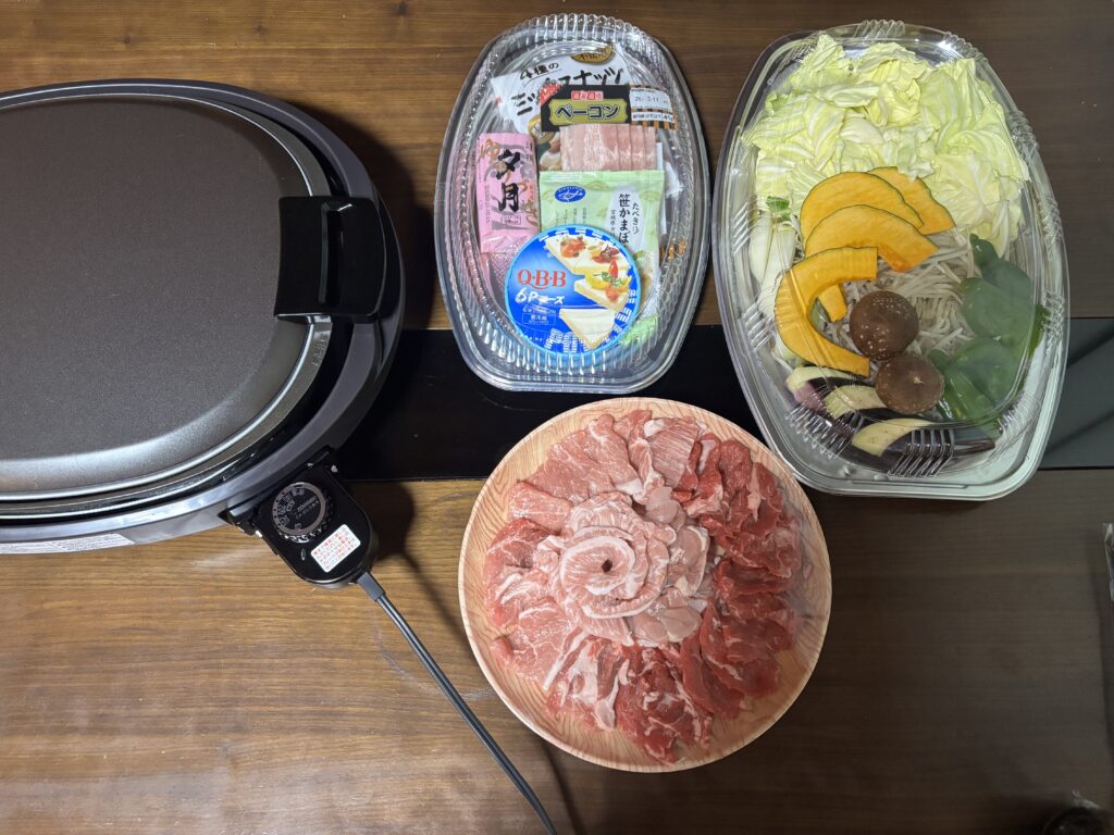 夕食は外でバーベキューをしても良いし、リビングで焼肉をしても良いということで、お肉とお野菜、あとスモークチップ用にチーズやかまぼこ、ナッツなどが付いていました。