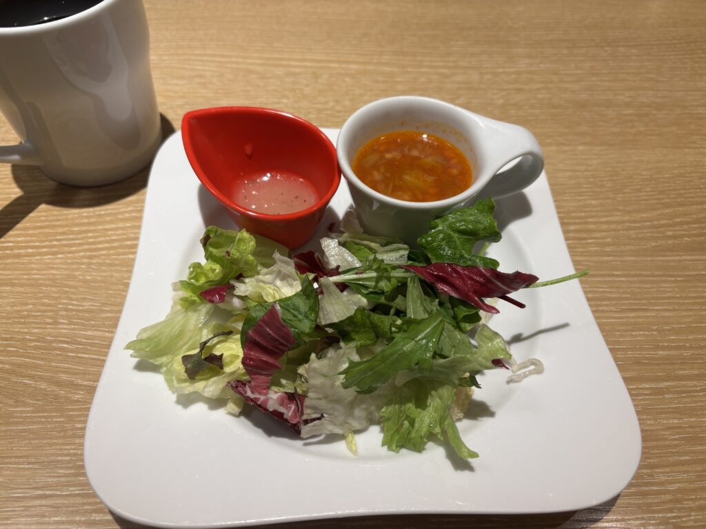 まずはセットのサラダとミネストローネスープが運ばれてきました。