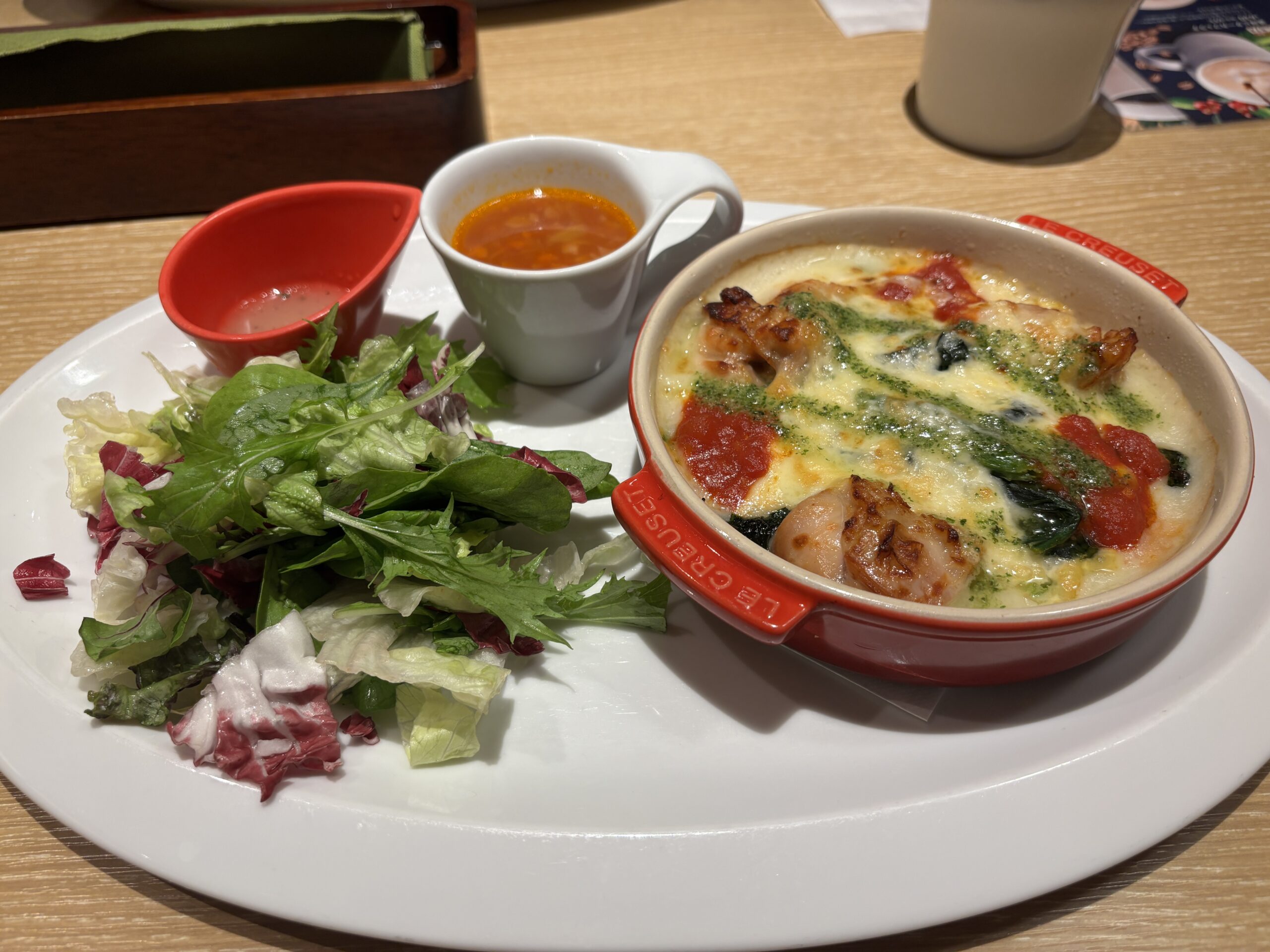 「チキンとほうれん草のドリア」は、サラダとスープがお料理とワンプレートで登場。