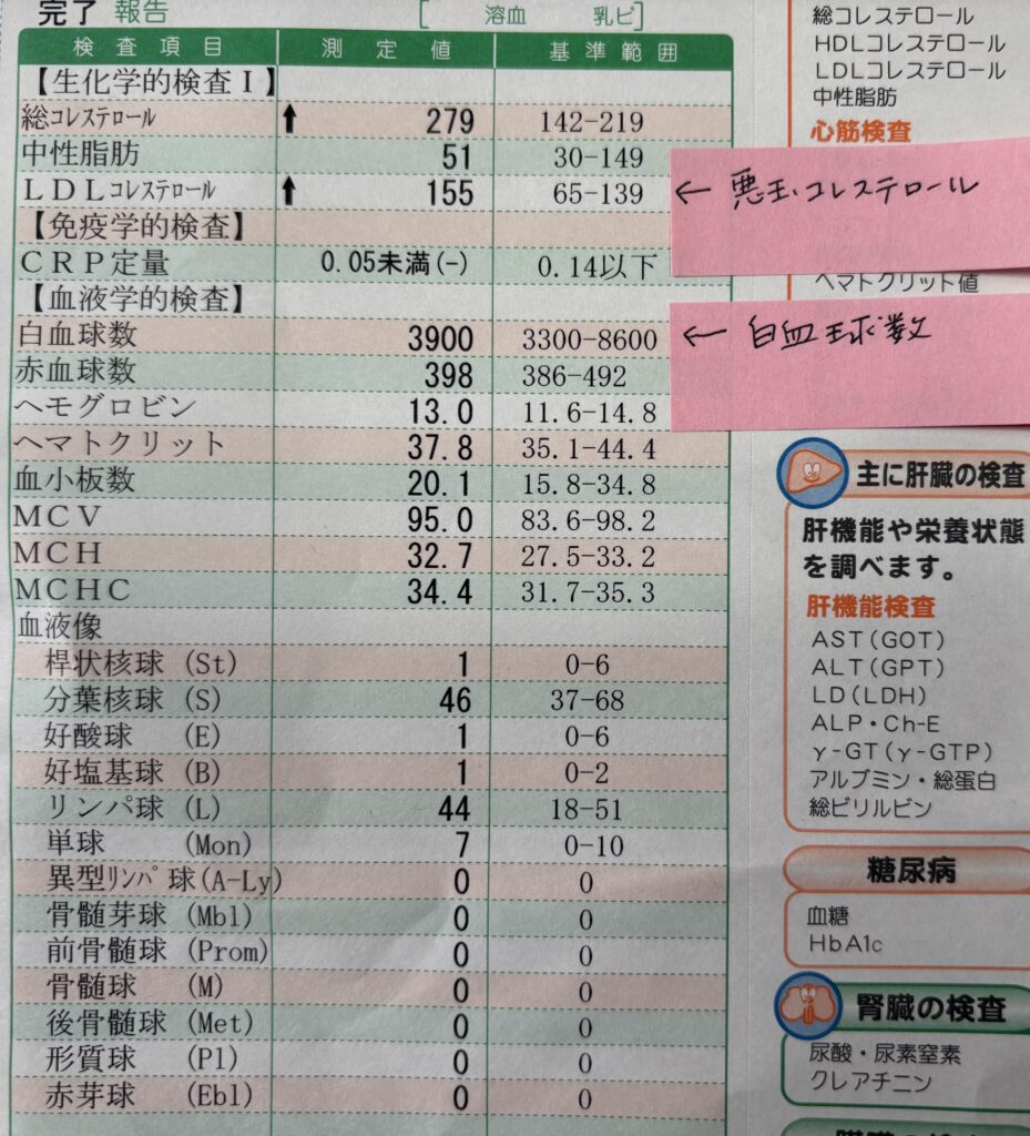 先日受けた「コレステロール値」と「白血球」の再検査結果が出てきました。