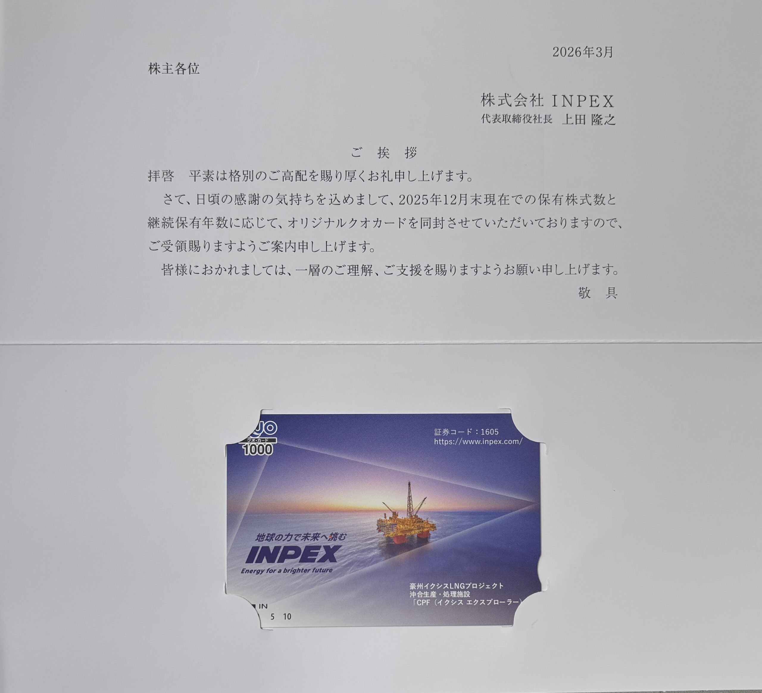 INPEX(1605)から待望の初優待!