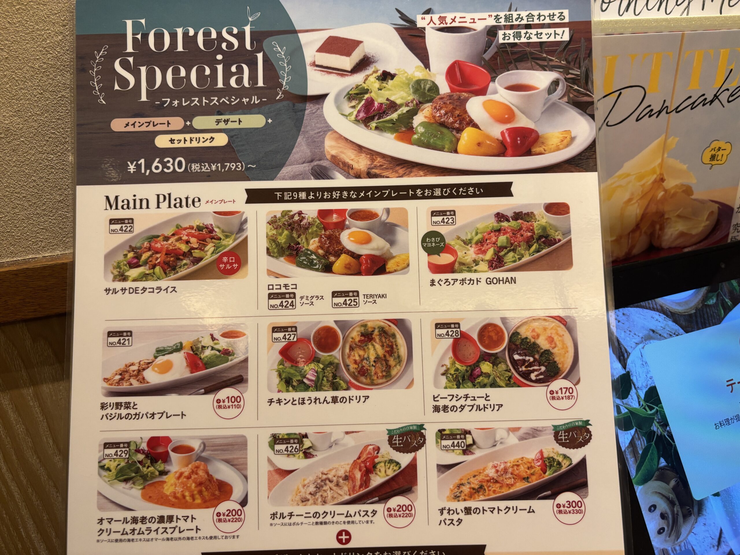 メイン・ドリンク・パンケーキがセットになった、お得な「フォレストスペシャル」を注文。