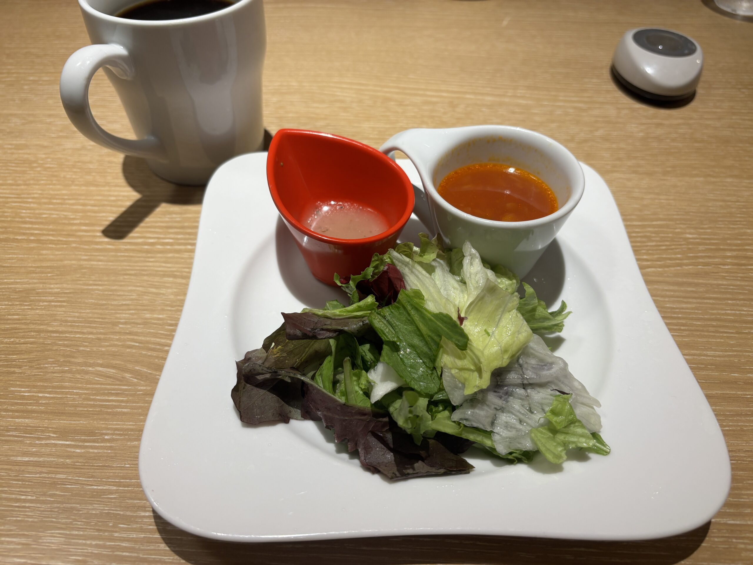 サラダとスープ。コーヒーは食前にもってきていただきました。