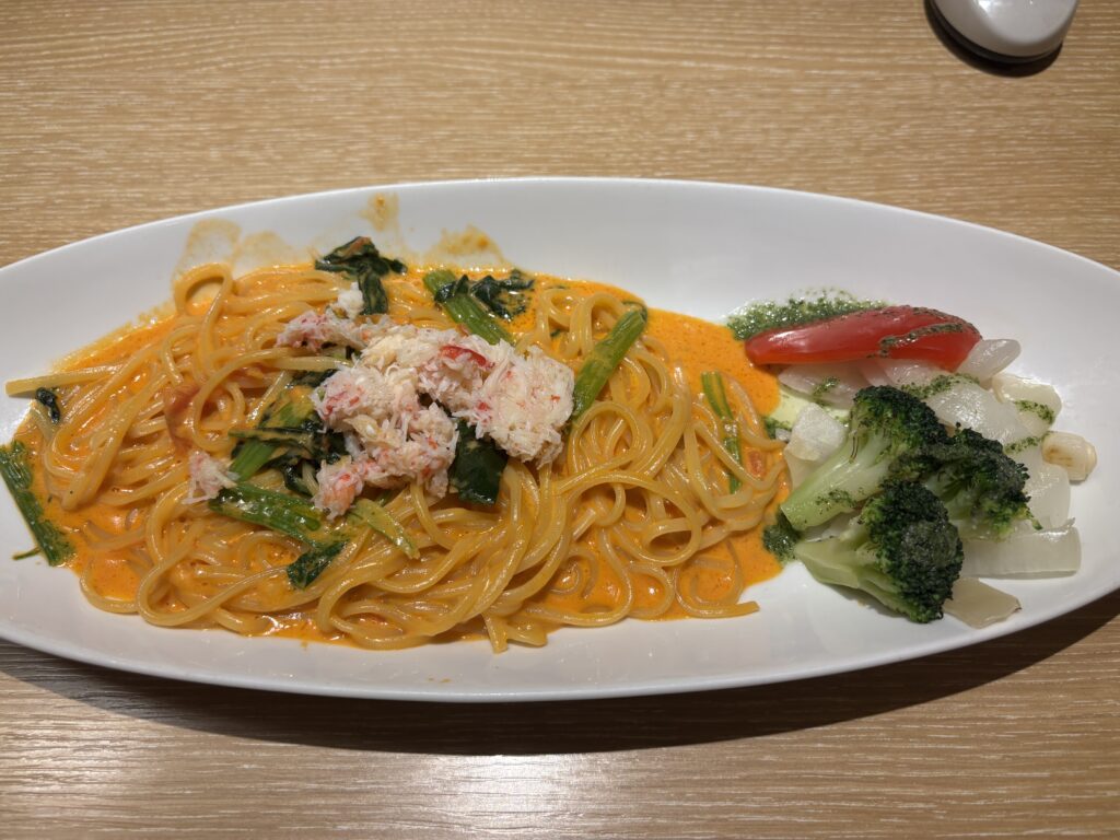 私が選んだパスタも、温野菜がたっぷり添えられていて、野菜がしっかり摂れるのが嬉しい。